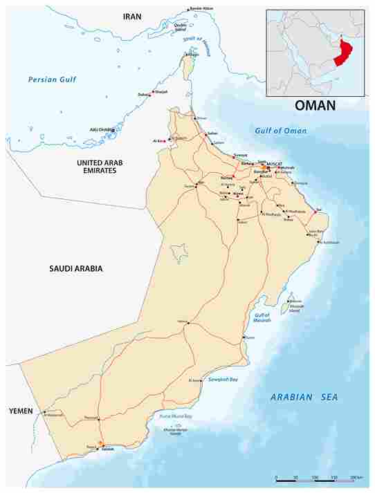 Der vorderasiatische Staat Oman befindet sich im Osten der arabischen Halbinsel und grenzt an insgesamt drei Länder: Saudi-Arabien, Jemen und die Vereinigten Arabischen Emirate. Die Küstenlinie Omans verläuft entlang dem Arabischen Meer und dem Golf von Oman. Oman verfügt über eine Landfläche von 309.500 km², die wiederum in 11 Verwaltungsgebiete (Gouvernements) unterteilt ist. Dazu gehören unter anderem Al Batinah, Dhofar und Maskat. Das Bild von Oman wird zweifelsohne von den weitreichenden Wüstenlandschaften geprägt und seinen Sanddünen, wie in etwa innerhalb von Rub al-Khali. Doch neben weitläufigen Wüstenlandschaften verfügt Oman auch über Gebirgszüge, wie das das Hadschar-Gebirge. Genau hier befindet sich auch gleich der 3.009 Meter hohe und damit höchste Berg Omans, der „Jebel Shams“. Beeindrucken kann Oman darüber hinaus mit seinen schönen Stränden, Küstengebieten und Fjorden, allen voran auf der Musandam-Halbinsel. Die Hauptstadt Omans ist Maskat, die aktuell etwa 1,5 Millionen Einwohner zählt. Die Gesamteinwohnerzahl Omans beläuft sich anhand aktueller Berechnungen auf ca. 4.5 Millionen.