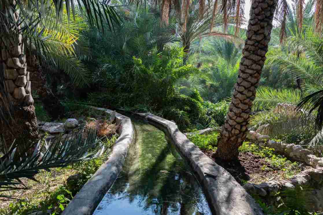 Der Begriff „aflaj“ ist die Mehrzahl von „falaj“, was im Arabischen so viel wie „verteilen“ bedeutet. Damit ist der Sinn des gleichnamigen antiken Bewässerungssystems erklärt: Das im Sultanat Oman seltene Wasser wird aus unterirdischen Quellen gefördert und über ein kilometerlanges, meist unterirdisch verlaufendes Kanalsystem an Bewohner und Landwirtschaft verteilt – zur Trinkwasserversorgung, für den Ackerbau und die Viehzucht.